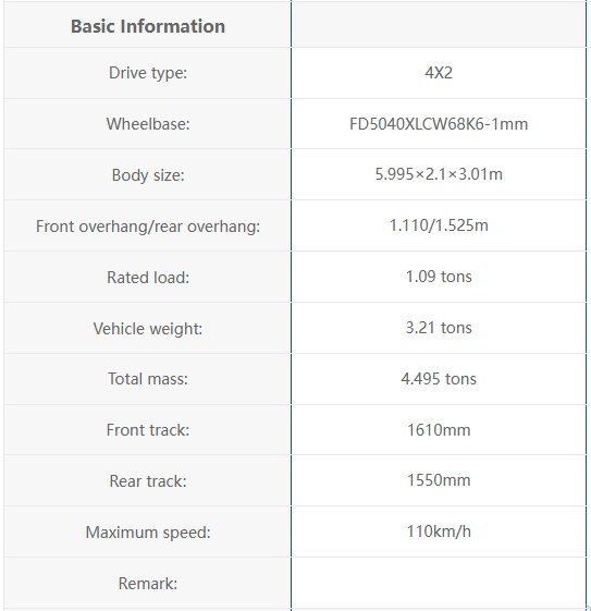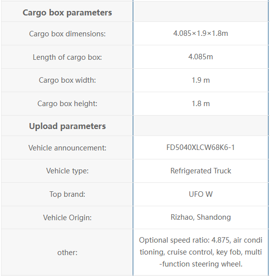 The Feidian W5 163HP 4X2 refrigerated truck (FD5040XLCW68K6-1) offers efficient cold storage transport with a 4.085-meter cargo box, ideal for perishable goods. Equipped with a Yunnei D30TCIF2 engine, it provides 163 horsepower and meets the stringent China VI emission standard.